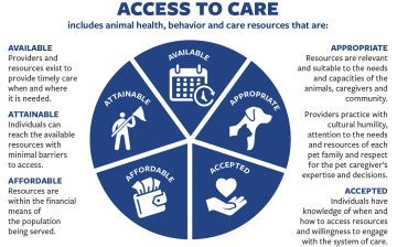 “The first thing that folks tend to think is that it’s all about economics, right? And that if it’s just affordable, if it’s free care, then it’s accessible,” says Wojdak. In reality, “access” is more complex. Building on principles used in human social services, the HSUS defines “access” as providing resources that are available, attainable, affordable, appropriate and accepted.